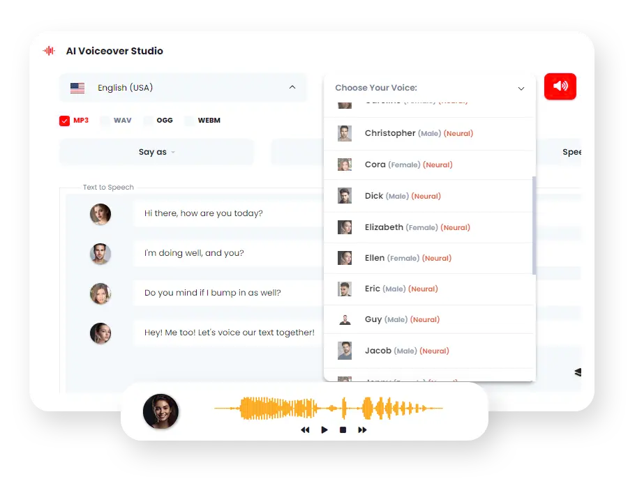 Generate natural-sounding voiceovers with realistic tone and expression, ready to use across videos, ads, and other marketing content without studio setup.